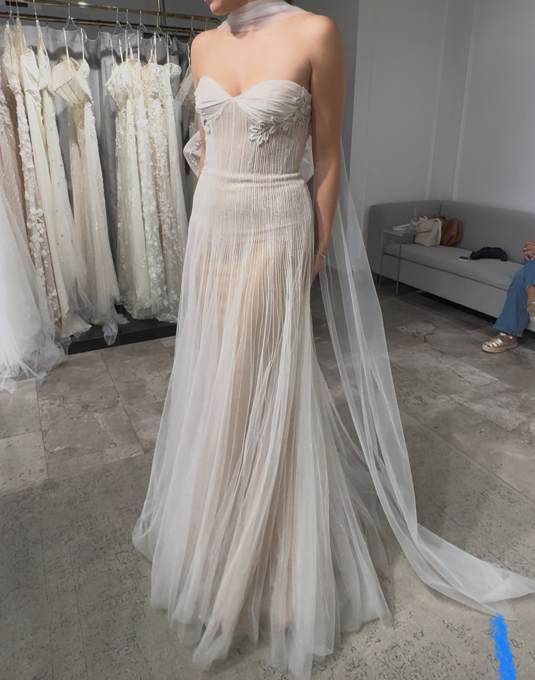 Vestido en corte A , de varias capas de tul de seda, pedrería y lentejuelas